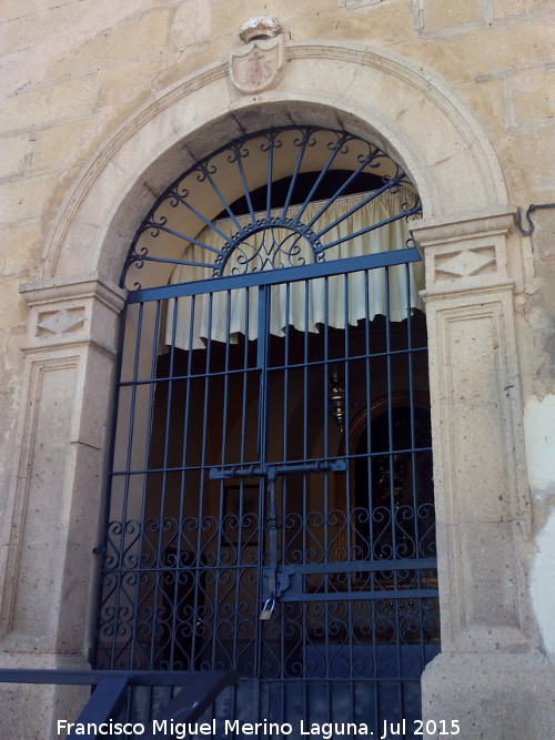 - Se accede a ella a través de una puerta de arco de medio punto con un escudo en su clave con las siglas de Jesucristo JHS.