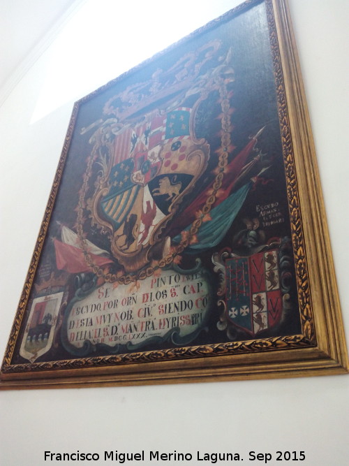 - Como elementos decorativos, los escudos de los Austrias y de Andújar a los lados y en el centro sobre el balcón un relieve de estuco de la alegoría de la Justicia y la Paz.