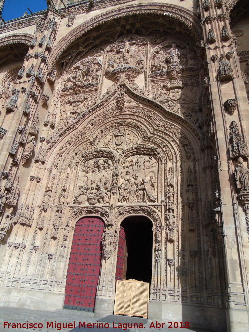 • Muy profusa en detalles entre los que destacan sobre las puertas los relieves de las escenas del Nacimiento y la Epifanía, cobijado todo ello bajo un gran arco conopial que es culminado por un Calvario, flanqueado por las efigies de los Santos Pedro y Pablo.
