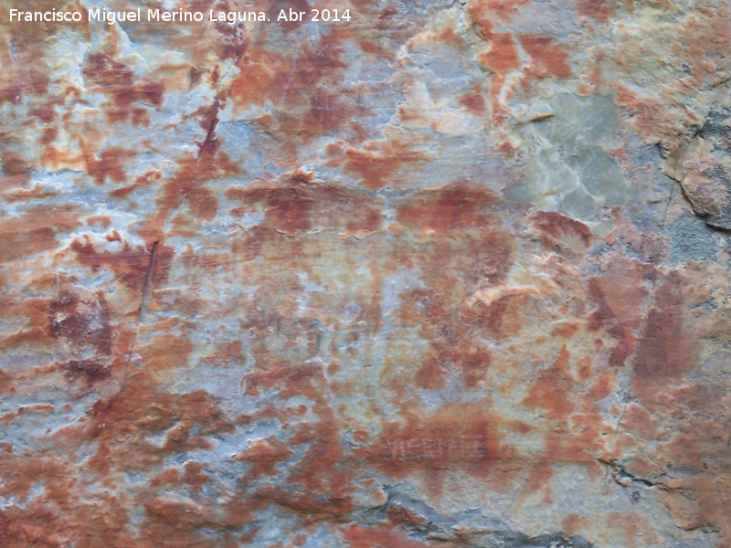 - Entre éstas nos encontramos manchas de color, diferenciando 2 zoomorfos, posiblemente cápridos –nº15 y 24 v alguna línea serpentiforme, muy repetida en el yacimiento, y que podría hacer referencia a corrientes de agua, debido a la proximidad del río.