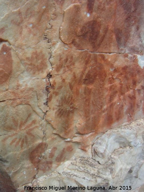 - Hacia la derecha y a un nivel inferior, en un saliente de la pared, se distingue con mucha difi cultad un pectiniforme acompañado de un sol, un grupo de puntos y diversos restos y manchas muy desvaídos y de color rojo claro. En la misma dirección se observan otras barras.