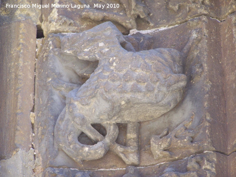- La portada Sur, la más representativa, es abocinada de arcos apuntados con baquetones en las jambas, apareciendo el escudo del obispo fundador que alberga la figura de una fuente de la que sale un sauce.