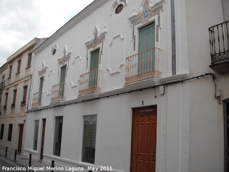 Los balcones del primer piso decorados con molduras y azulejos, y entre ellos una moldura decorativa de separación.