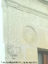 - Con sobremarco entre semipilastras decoradas con rombos y conjuntos de cuatro círculos, soportando un entablamento de bastoncillos.