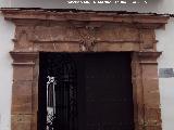 • Portada adintelada entre pilastras planas que soportan un entablado con relieve decorativo y en su clave una gran hoja de acanto con tondo que tiene un sol en relieve.
