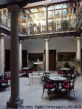 - El palacio se distribuye en torno a un patio porticado con galería cerrada alta.