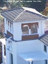 Tiene una torre mirador que en su frente tiene una hornacina de azulejos con farolillos y tejadillo soportado por columnas salomónicas.