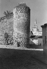- Estaba defendido por diversas torres, de las que tan sólo subsisten dos, una de planta circular, situada en el ángulo Noreste, y otra de planta cuadrada que alberga una puerta de acceso al castillo en acodo, con un arco apuntado de ladrillo y un pasadizo abovedado.