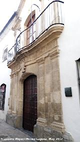 - Portada monumental de arco rebajado entre dobles pilastras planas sobre la que tiene un escudo heráldico y sobre él, un balcón con tirantas coronado por frontón partido.