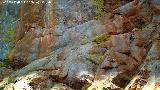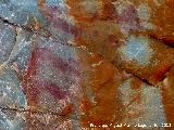 • El grupo II se encuentra 1’50 m a la izquierda del anterior y a 2’60 m del suelo. Su color es rojo y su conservación es mala. No obstante, junto a restos y barras distribuidas de forma dispersa, se observan cuatro antropomorfos típicos simples, alguno de ellos muy incompleto y otro asociado a un zoomorfo cuadrúpedo con dos apéndices a modo de cuernos.