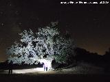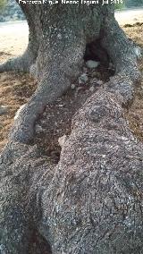 Quejigo de gran porte que una de sus grandes raíces tiene un hueco que asemeja la forma de una pileta.