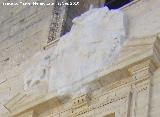 • El inferior, con un arco de medio punto, está flanqueado por dos pares de pilastras toscanas, rematado por un frontón curvo partido.