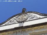 - La parte superior de la fachada acaba rematada en una balaustrada de piedra con macetones y cuatro llamas; en el centro las iniciales del antiguo propietario.