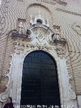 • La fachada principal es en ladrillo visto presenta una portada en piedra caliza blanca con dos columnas de mármol cuyos capiteles sostienen una hornacina con la imagen de la Purísima.