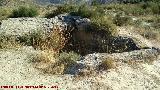 • Hoy en día puede percibirse algo del corredor a través de un pequeño ortostato vertical visible más allá de la cámara hacia el sur, en cuya dirección se orienta esta sepultura; en este caso se trataría, al igual que en las sepulturas 3 y 6, de un acceso escalonado desde el corredor, más alto, a la cámara.