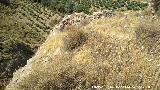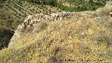 • Los muros son de mampostería irregular unidos con argamasa dura de cal y arena. Se trata de un doble recinto, uno situado en la cima del cerro y de una extensión menor; y otro que baja hasta media ladera, delimitando un recinto bastante más amplio. En el sector E se encuentra la puerta de acceso al recinto, que debió de ser en recodo. Se encuentra flanqueada por dos torres rectangulares, que conservan una altura de 1,20 metros. Hacia el Sur se extiende la roca que cae sobre el barranco y que está fortificada en aquellos puntos en los que es más vulnerable. Hacia el Norte, el recinto se desdobla, un muro cierra la altura del cerro hasta llegar a la roca, mientras que otro baja por la ladera hasta llegar a una torre rectangular, situada en el sector Oeste, y desde allí se dirige hacia la roca del Sur, donde enlaza con un muro que, aprovechando la roca, baja del recinto superior.
