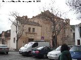 - Encontramos una sencilla fachada, cuyo elemento más significativo es su portada manierista. Esta se compone de un arco de medio punto, jalonado de dos medias columnas toscanas sobre plintos, coronándose todo el frontón curvo y partido, que aparece centrado con un escudo del Carmelo.