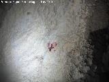 • Hacia el interior de la cueva en su pared izquierda encontramos un pequeñísimo cruciforme con restos de pintura a su arrededor. Todo en un color rojo obscuro sobre una pared de calcita blanca.