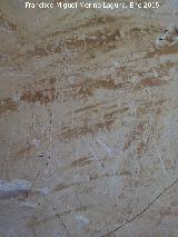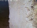 • Encontramos una serie de grabados, antiguos y numerosos, del orden de varias decenas, que tapizan de manera casi imperceptible las paredes de esta sala. Aparecen grabados sobre el yeso de las paredes utilizando un fino punzón; su forma y tamaño, es muy variado y su distribución totalmente anárquica, superponiéndose a veces unos sobre otros. Entre los motivos grabados predominan principalmente, con un amplio abanico de formas iconográficas, los cruciformes, pues veinte de los treinta y dos grabados recogidos se corresponden con cruces de calvario, provistas o no de la representación simbólica del sudario del descenso. Tres grabados se corresponden con aves, de las cuales dos se pueden identificar con cigüeñas, dos más se corresponden con figuras antropomorfas de guerreros y las cuatro restantes se reparten entre dos epigrafías, en una de las cuales leemos la palabra SAN, un grabado que podría ser una representación solar y otro de gran tamaño junto a una cruz. En uno de los laterales del arco de entrada a sala del Abad, aparece junto a otras representaciones una pequeña cruz bizantina.