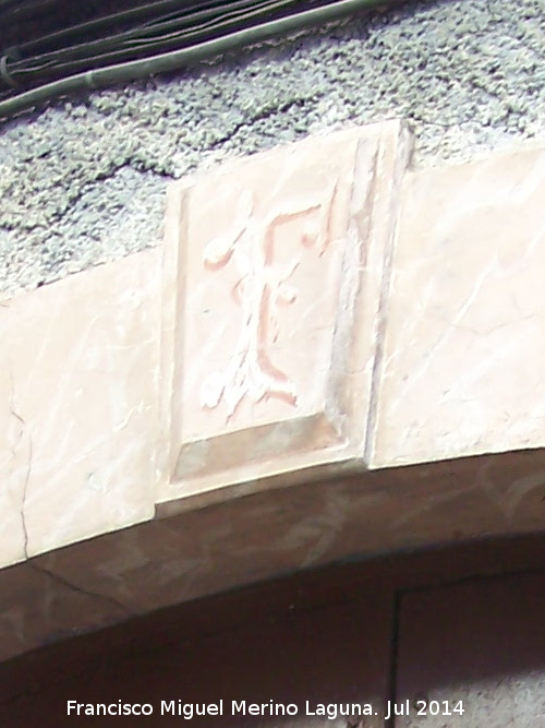 Vanos de la planta baja con marco y arco rebajado con clave decorada con las iniciales de los propietarios.