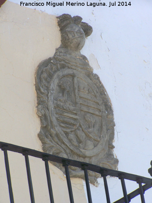 • En su fachada a la derecha del balcón principal presenta el escudo es de estilo barroco, ovalado, dividido en cuatro cuarteles sobre diversas molduras y distintos símbolos, con vegetación de acanto y casco plumado.