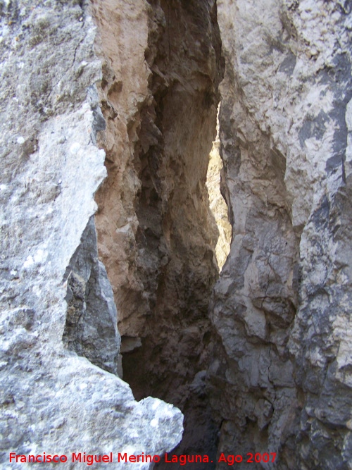La grieta tiene dos salidas una en el antiguo aprisco y otra que da a media altura en la pared rocosa de afuera del aprisco