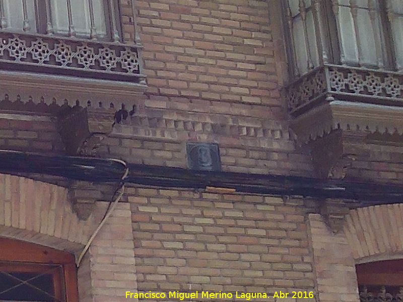 - Destaca el empleo del ladrillo de diferente tonalidad en el recercado de los huecos, en las líneas de impostas y en las bandas laterales del paño de la fachada.