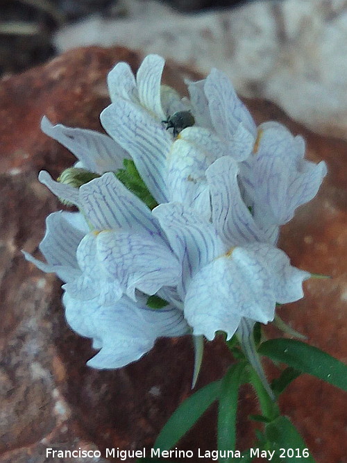 - Las flores aparecen en racimos densos, con dos labios y espolón basal, de color blanco o lila con el paladar naranja-amarillento, y venas más oscuras.