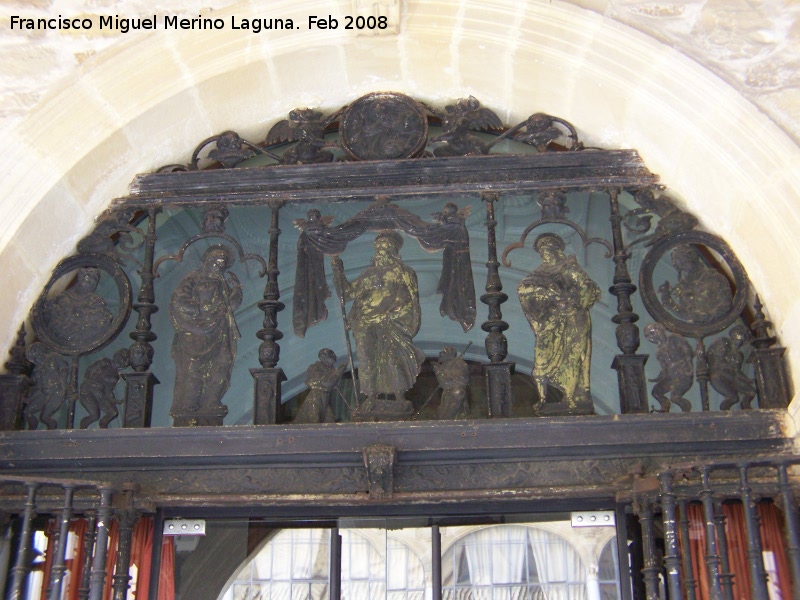 • En el eje de la puerta principal se levanta la Capilla - Panteón, a la que se accede por una imponente reja de tres puertas, diseñada por Vandelvira en 1573, siguiendo una modalidad propia de estos años de reja-puerta de gran solidez.