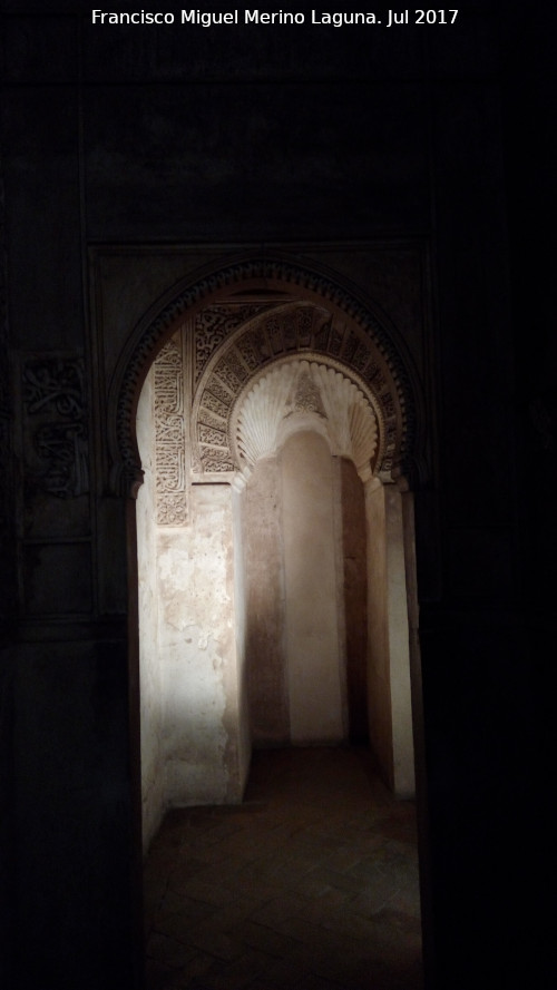 - El muro donde se encuentra el arco que da entrada al salón tenía dos huecos, el de la derecha daba a una puerta que conducía a estancias superiores del sultán para el invierno y también para dar acceso a las almenas de la torre.