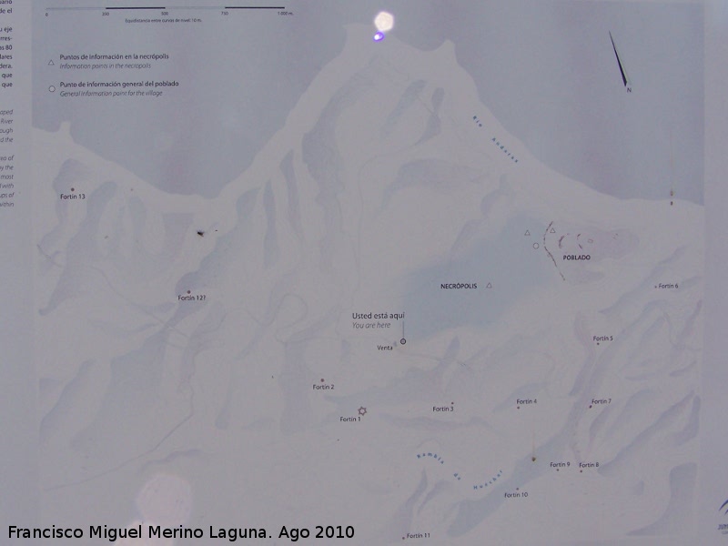 - Finalmente, la ciudadela fortificada situada en el extremo interno del poblado (Línea IV) sólo ha sido investigada por el momento mediante varios sondeos, que confirman su envergadura, ya que sus murallas alcanzan los 6 m de espesor. En el interior del recinto se aprecia una gran depresión en el terreno, que fue interpretada por L. Siret como una cisterna.