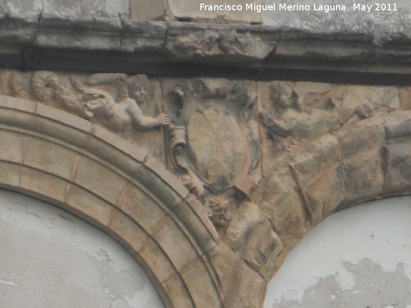 - El edifico es un gran cuadrilongo en el que destaca dos portadas al exterior, una septentrional, única en el clasicismo jiennense por estar realizada en mármol con decoración de bucráneos. Mientras la occidental se configura en una galería de seis arcos de doble planta, decorada con escudos heráldicos y las efigies de la familia condal, junto a otros elementos ornamentales en la arcada inferior.