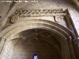 Portada gótica isabelina de arco rebajado con escudos heráldicos en las enjutas bajo una guirnalda y sobre ésta una crestería en buen estado de conservación.