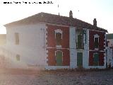 - Cortijo cuya fachada está dividida en tres calle, las laterales pintadas de granate y la central de blanco con un balcón cerrado de hierro fundido.