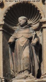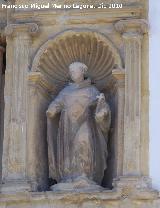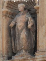 - En el cuerpo superior, a ambos lados de los machones recrecidos, son instaladas dos hornacinas con las imágenes de San Miguel, a la izquierda, pisando al demonio, con una espada en una mano y una balanza para pesar las almas buena y las malas, patrón de la ciudad, y en la hornacina derecha San Juan de la Cruz -beatificado en 1663-, copatrón de la misma, esta última no era originariamente de San Juan, sino de San Jacinto, un dominico que tenía el mismo tipo de hábito que un carmelita solo que con diferentes colores. La imagen está mutilada porque a San Jacinto se le representaba con una virgen en la mano y en la otra llevaría una custodia, los dos elementos que eran atacados durante la reforma protestante, lo que ocurre es que cuando se nombró a San Juan como compatrono se cambió la virgen por la cruz y se le amputó directamente el otro brazo.