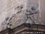 • Sobre el frontón que remata el balcón el escudo de armas de los Cárdenas, a la derecha el linaje de los Valdivia y en la izquierda el de los Cárdenas, sostenidos por tenantes juveniles de bella factura que sostienen los escudos sobre cueros recortados, con yelmo y cimera de perfil.