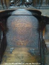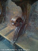 - Cada sitial tienen además de los adornos tallas en el asiento y bajo el asiento, y dos cuadros en talla sobre motivos religiosos.