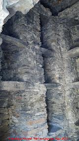 - Estos nichos resultan de la colocación, de forma regular, de gruesas y planas lajas de pizarra entre las dos hiladas de piedra de los extremos de cada paño y el pilarete central, que marca la separación entre ambas filas.